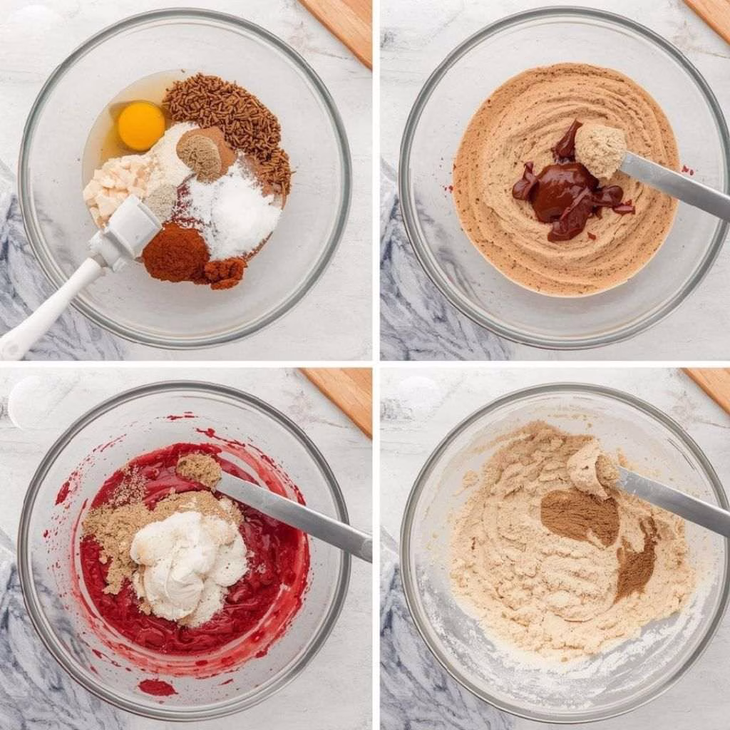 Start by combining warm milk, sugar, melted butter, salt, yeast, and red food coloring in a mixing bowl. Add eggs and sour cream, then gradually mix in flour and cocoa powder. Knead until the dough becomes smooth and elastic.