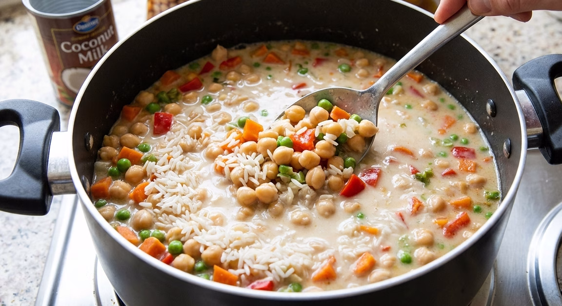 - Add coconut milk, chickpeas, vegetables, salt, and the rinsed rice. Pour in vegetable broth and mix everything evenly. Make sure the rice is fully submerged in the liquid.